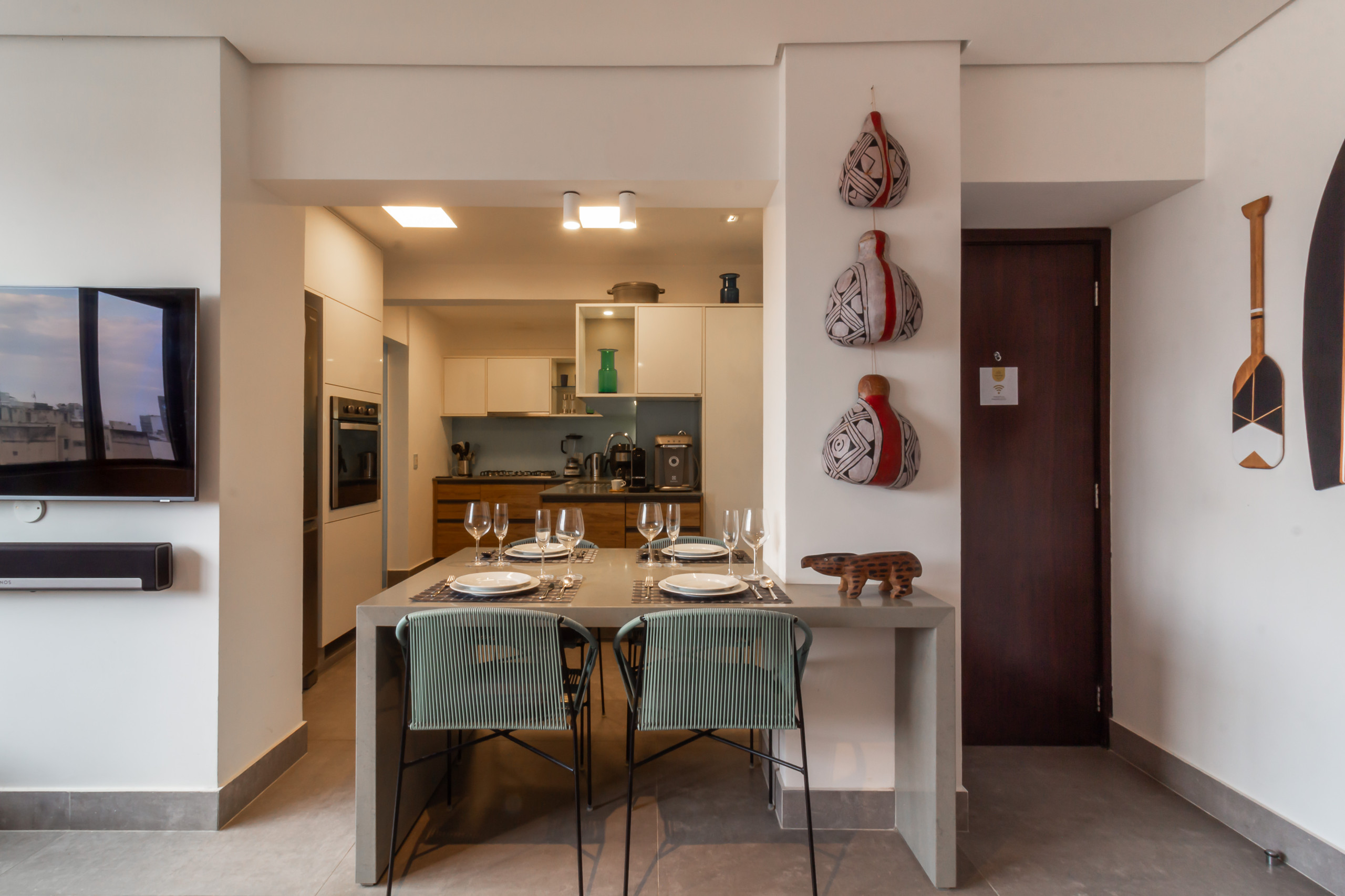 Dispõe de elevador, máquina de lavar roupa, máquina de secar roupa, ferro de engomar, acesso internet (wifi), secador de cabelo, ginásio, ar-condicionado, 1 Televisão.