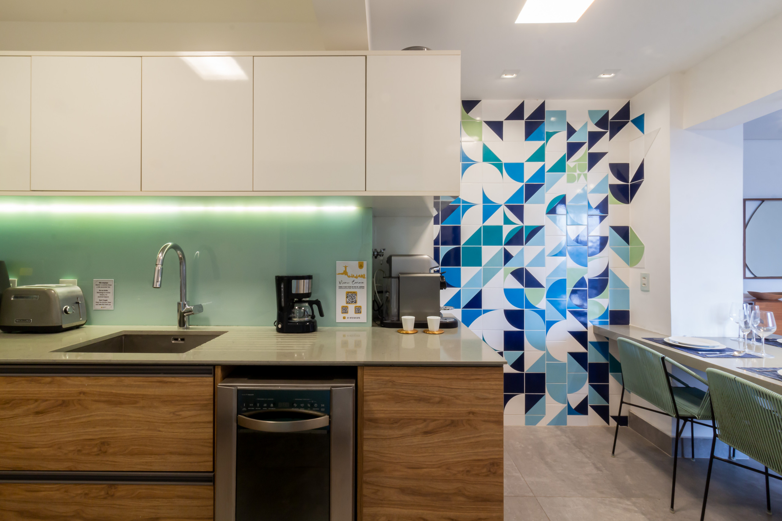 A cozinha é independente, de gás, está equipada com frigorífico, microondas, forno, máquina de lavar louça, louça/talheres, máquina de café, torradeira, fogão, pratos e tigelas, utensílios de cozinha.