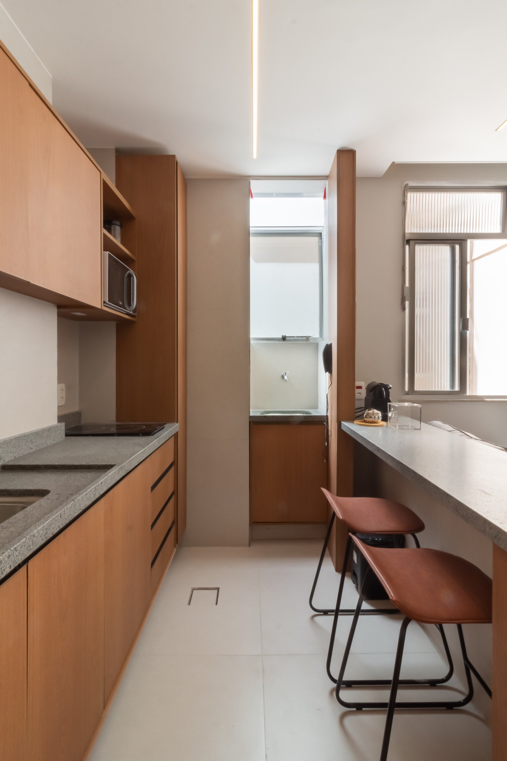 A kitchenette, de inducção, está equipada com frigorífico, microondas, louça/talheres, máquina de café, torradeira e máquina de sumos.