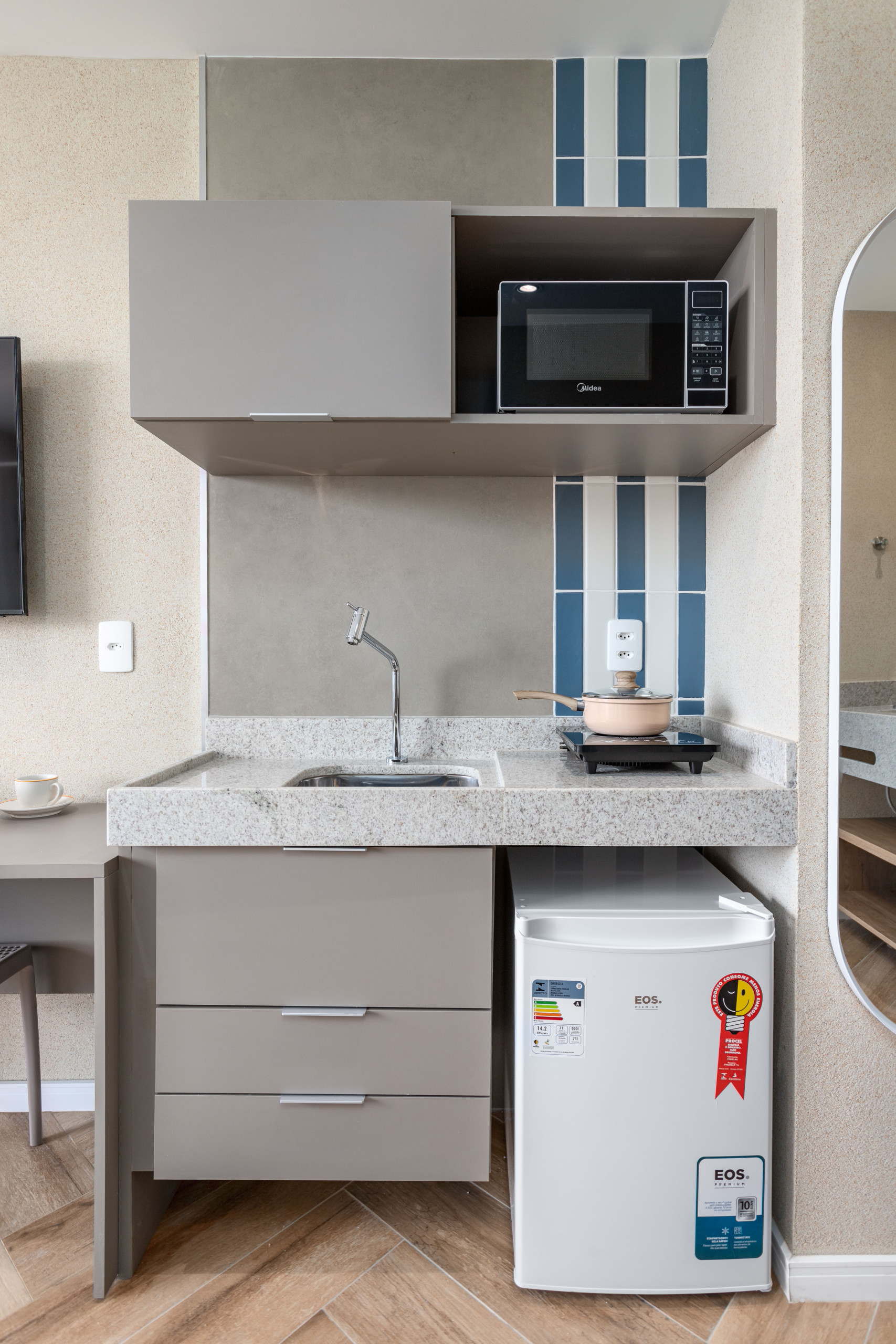 A cozinha é independente, eléctrica, está equipada com microondas, máquina de café, torradeira e fogão.
