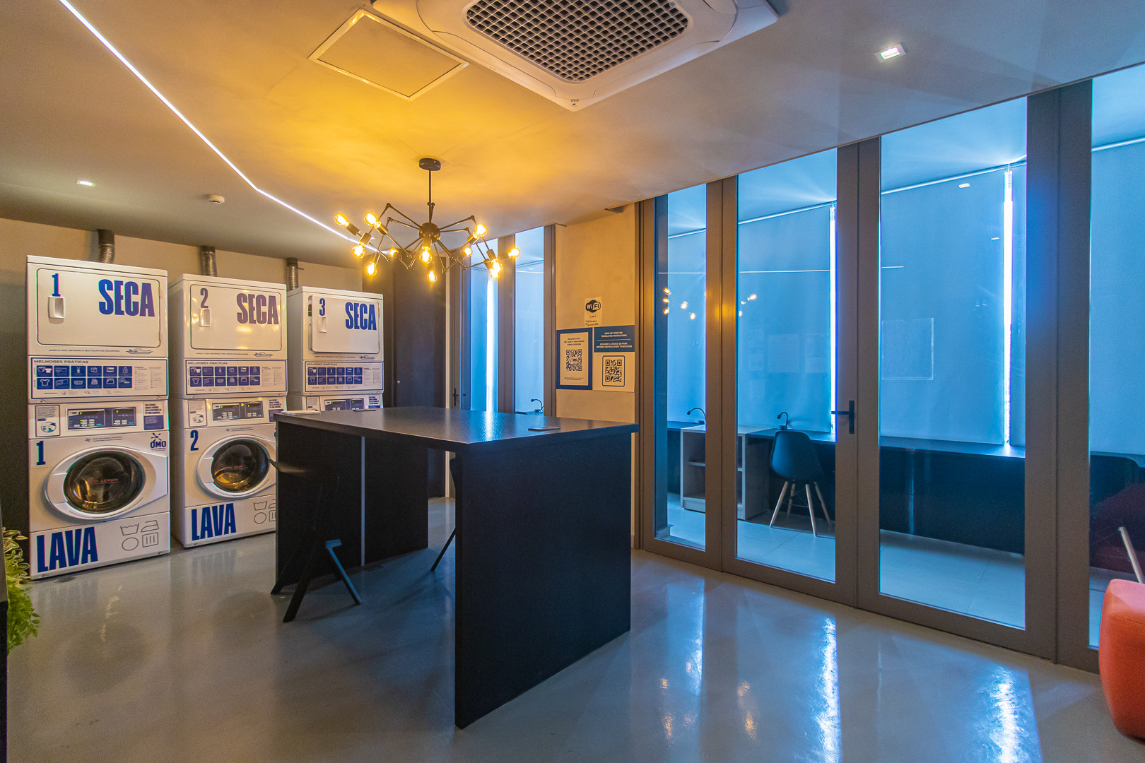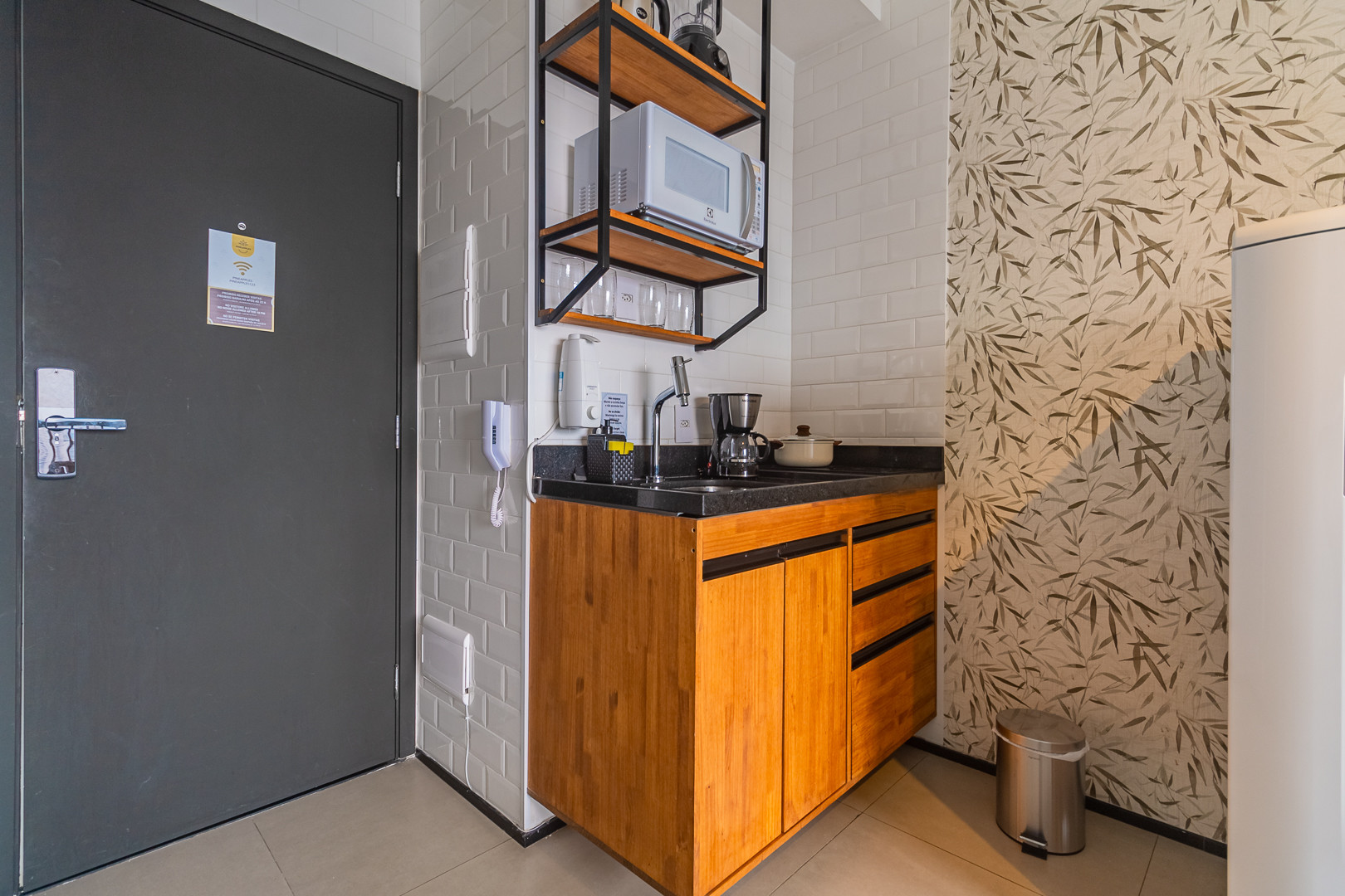 A kitchenette, de inducção, está equipada com frigorífico, microondas, louça/talheres, máquina de café e máquina de sumos.