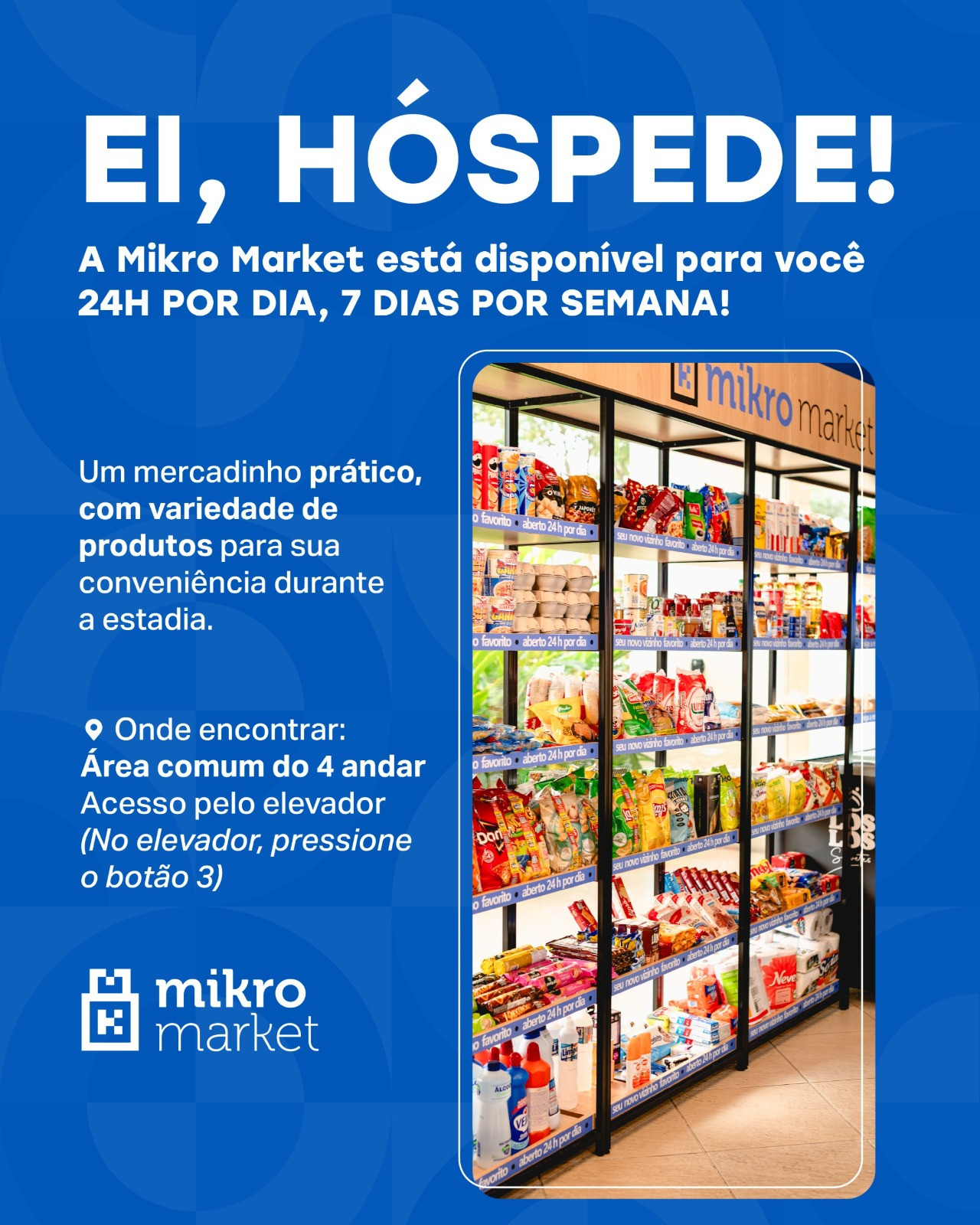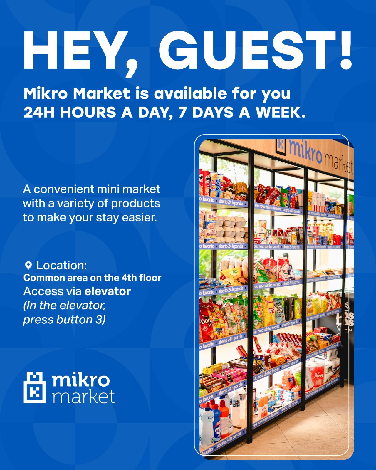 In addition, the building has a 24-hour mini-market, available every day of the week, offering convenience and a variety of products during your stay. The mini-market is located in the common area on the 4th floor, accessible by elevator (press button 3).