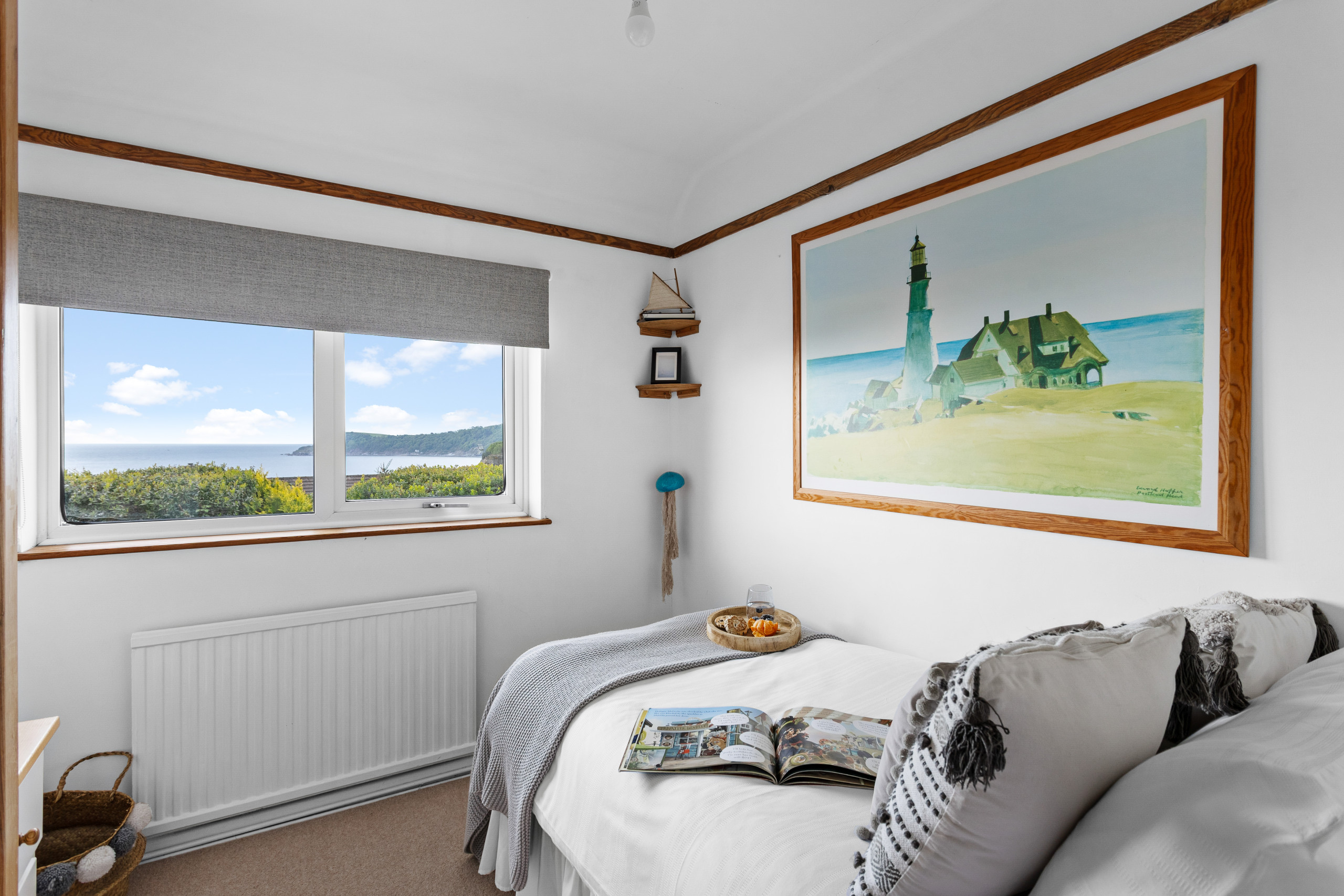 Upstairs, all three bedrooms are south-facing and boast sweeping sea views. The main bedroom features a king-size bed and built-in sliding wardrobes. The second bedroom offers a super king-size bed that can be converted into twin beds upon request, while the third is a cosy single room. The family bathroom includes a panelled bath with shower overhead, pedestal basin, and WC.