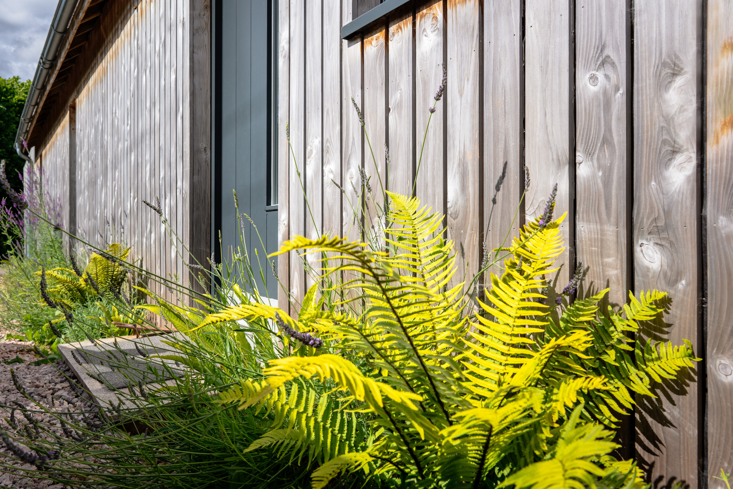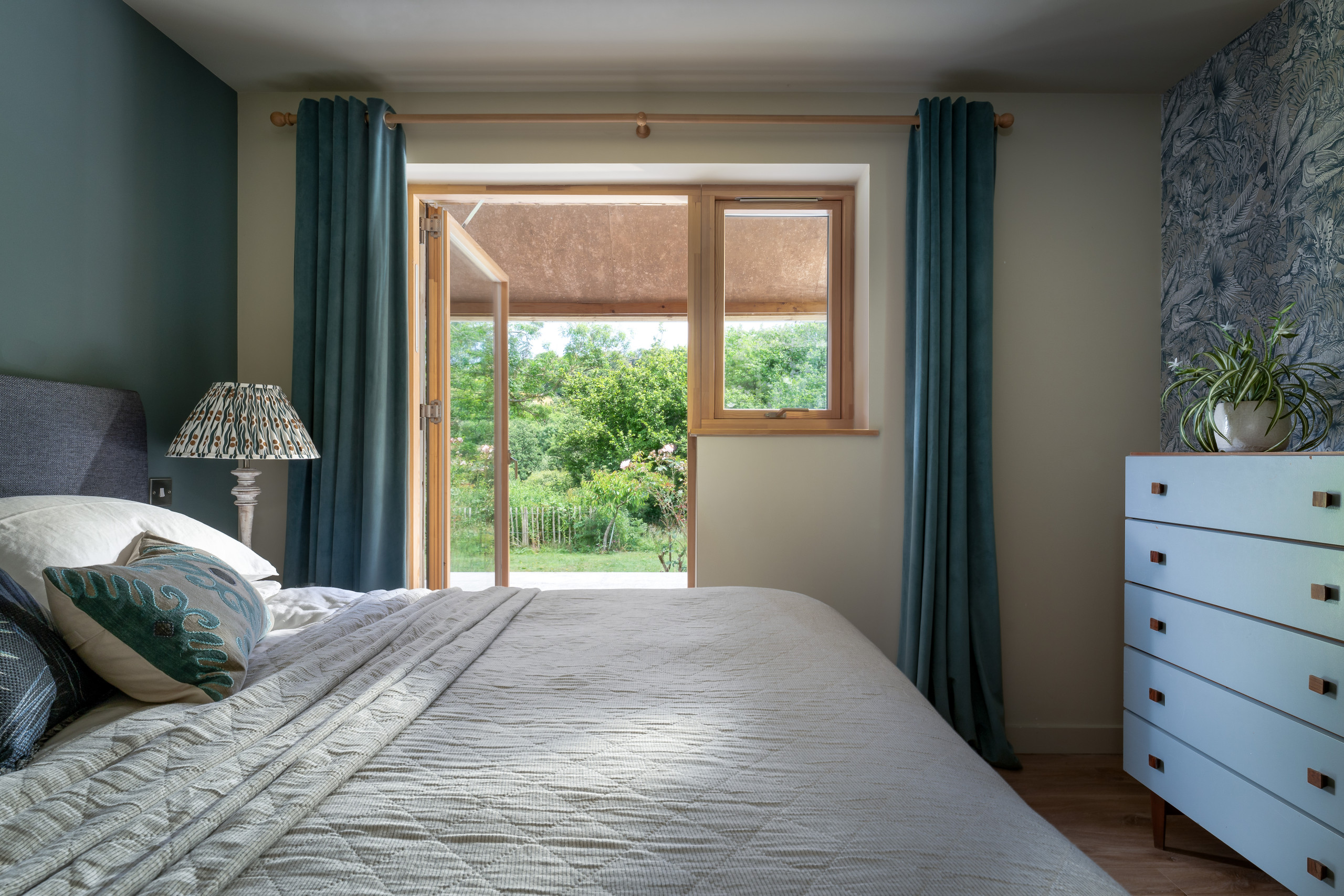 Each bedroom has a French door that opens onto the covered veranda and garden area. The larger super king room can also be configured into two single beds. The second bedroom has a king size bed. The third double futon bed is located on the mezzanine floor above the living room area. The bathroom is unique and is accessed from the hall way between both bedrooms. It has silent heat recovery ventilation with an integrated dual sink, a separate shower and double ended steel bath. There is also an additional toilet at the end of the hallway.