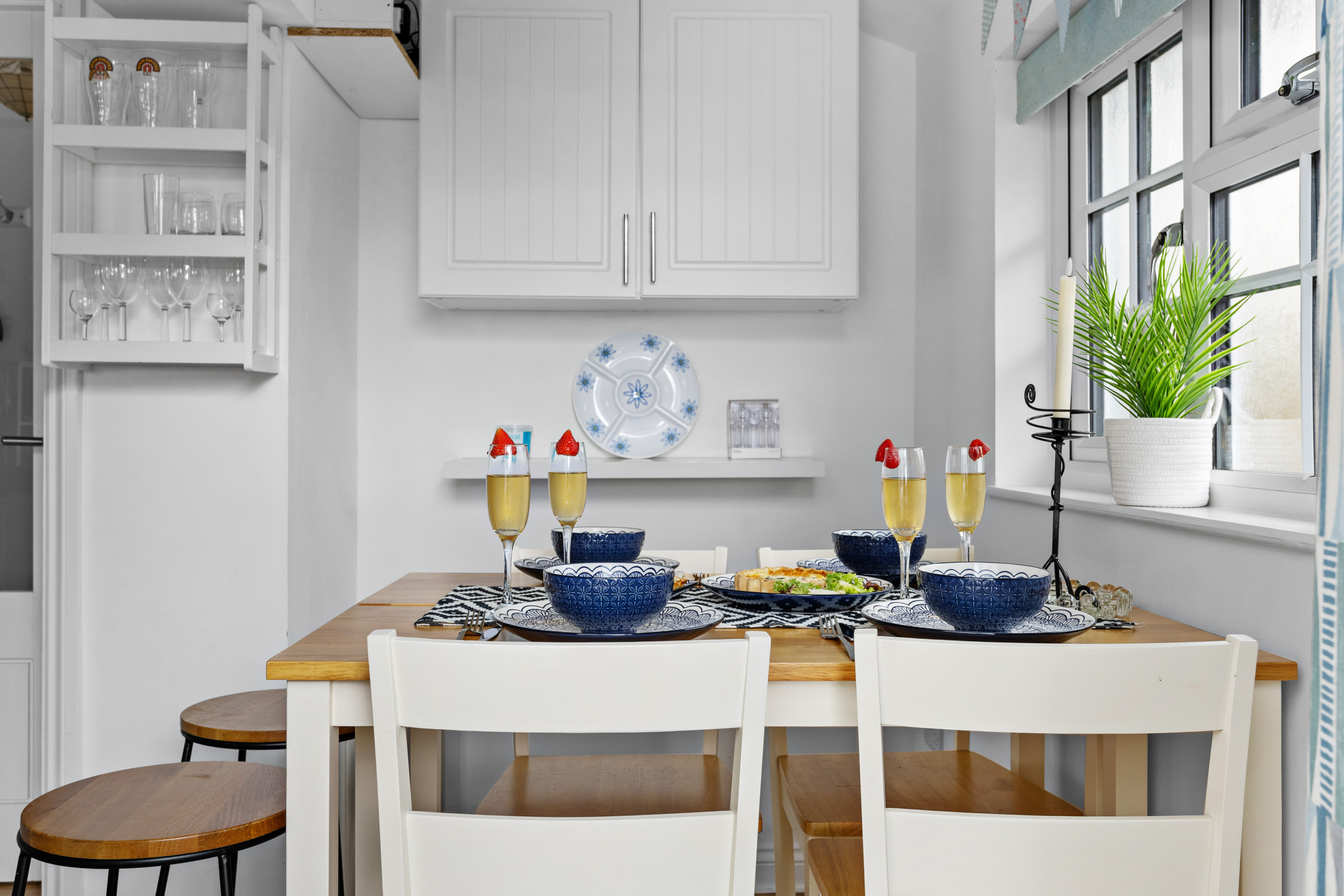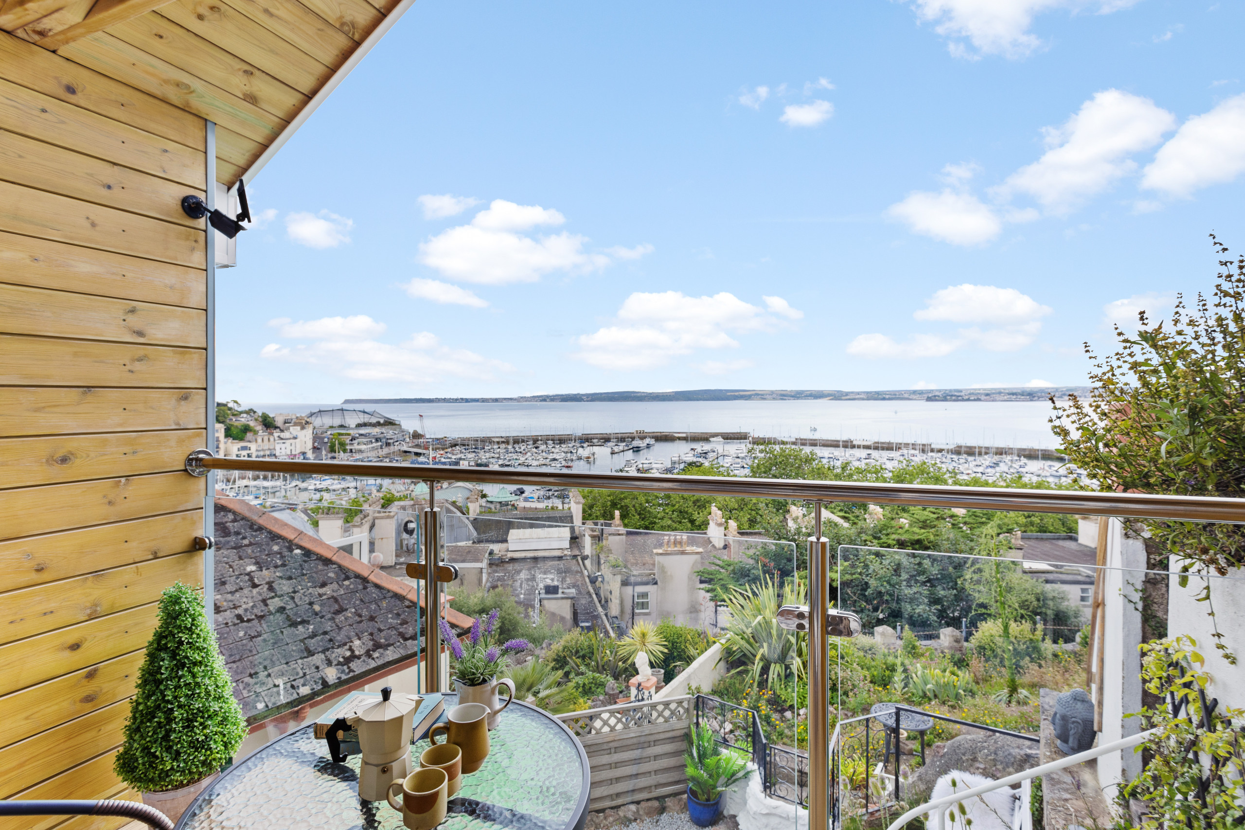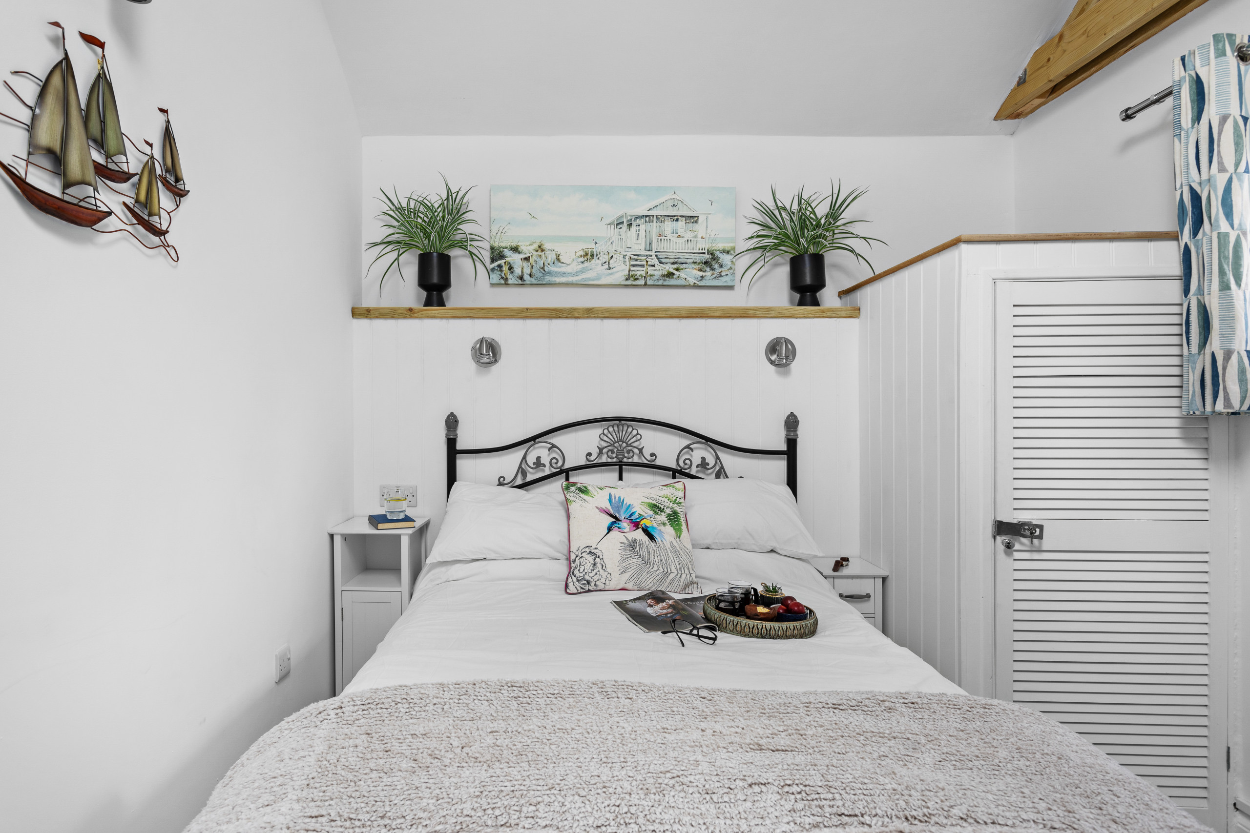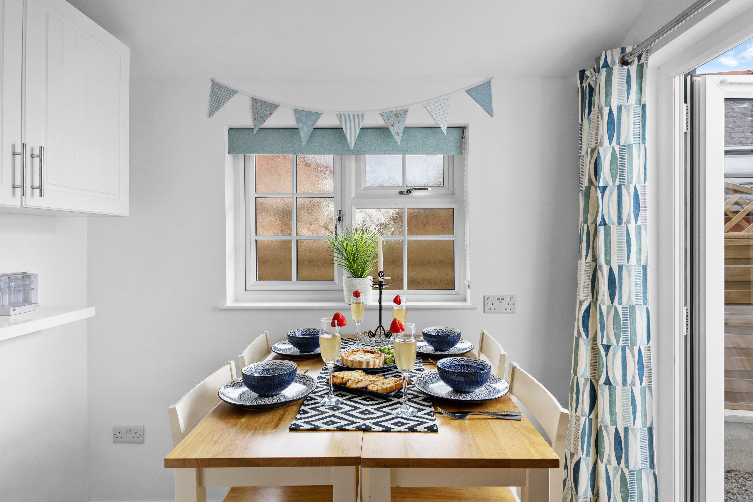 The moment you step inside The Boathouse, you’ll be captivated by the refreshing open-plan layout as the kitchen seamlessly merges with the living area, offering panoramic sea views of the marina and Torbay. As you settle into the cosy living space, let the sea air flow through, or take to the balcony to broaden the amazing vista. In the cooler months, also enjoy the warm glow of the wood-burning stove (ample wood, kindling, and firelighters are provided). Next to the kitchen area, the high dining table seats four. The feature-packed smart TV lets you stream your favourite on-demand programmes (subscriptions required) and adjusts to the ambient light for uninterrupted viewing, come rain or shine. There’s also a DVD player for your own choice of movies.
