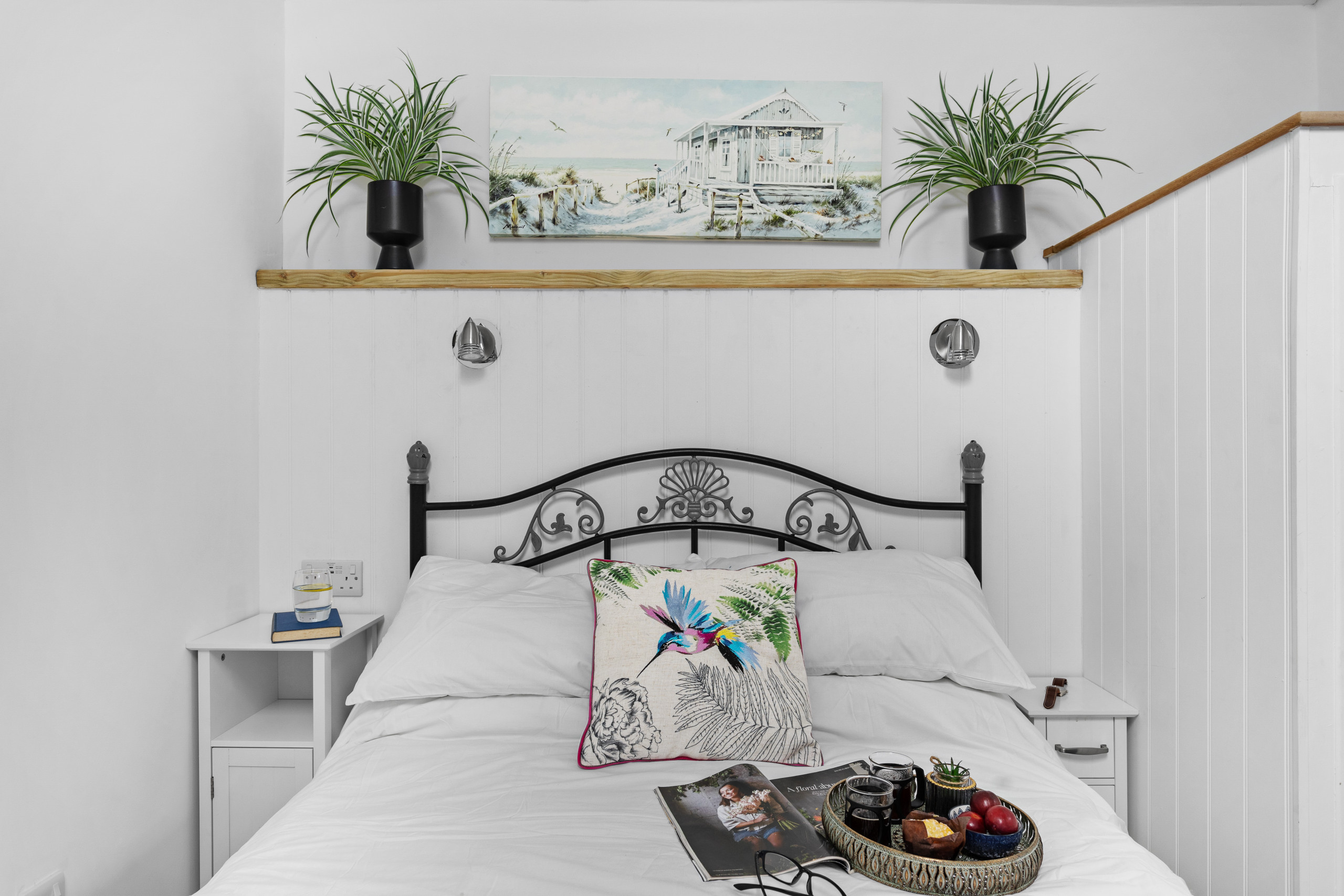Upstairs there are two further bedrooms. To the rear, a nice-sized double bedroom, and to the front, the king-size bedroom with a large open-plan balcony to enjoy yet more spectacular sea views. Each bedroom is also equipped with a smart TV.