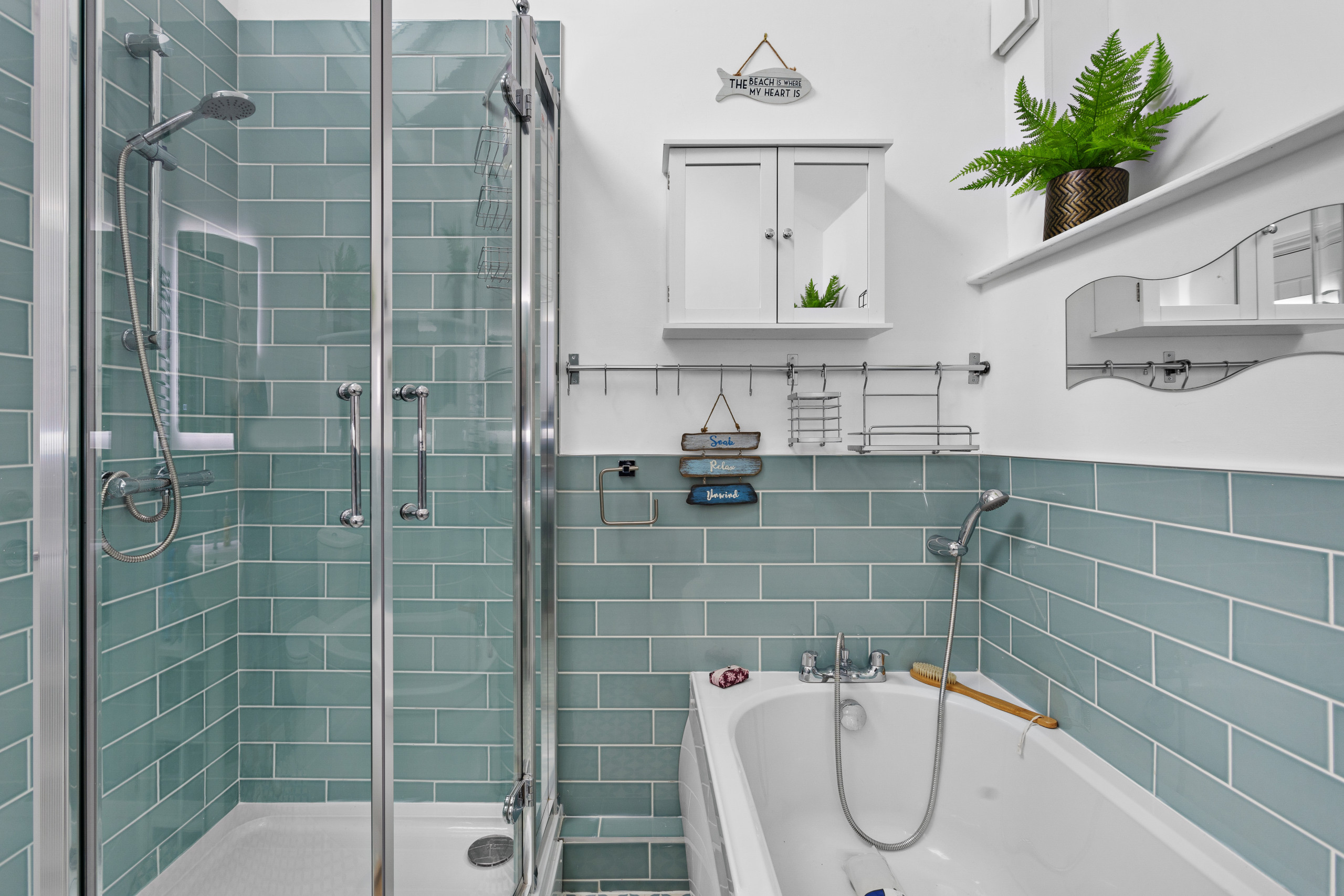 Between the bedrooms is the family bathroom. Framed in subtle nautical-green brick tiles, there’s a corner shower, curved shower bath with shower attached, plus a basin and toilet. It is also worth mentioning that there is also an large illuminated Bluetooth mirror with inbuilt speakers that plays music from any Bluetooth device.