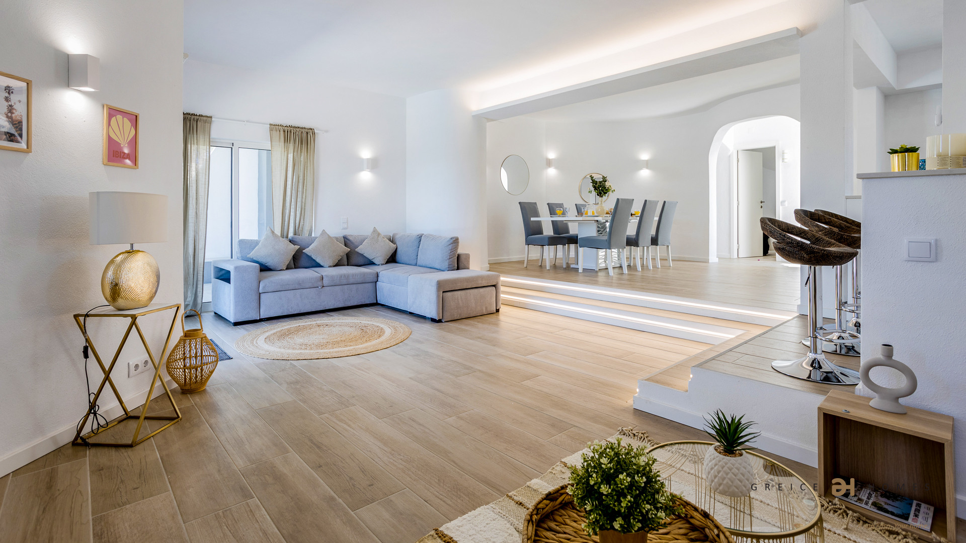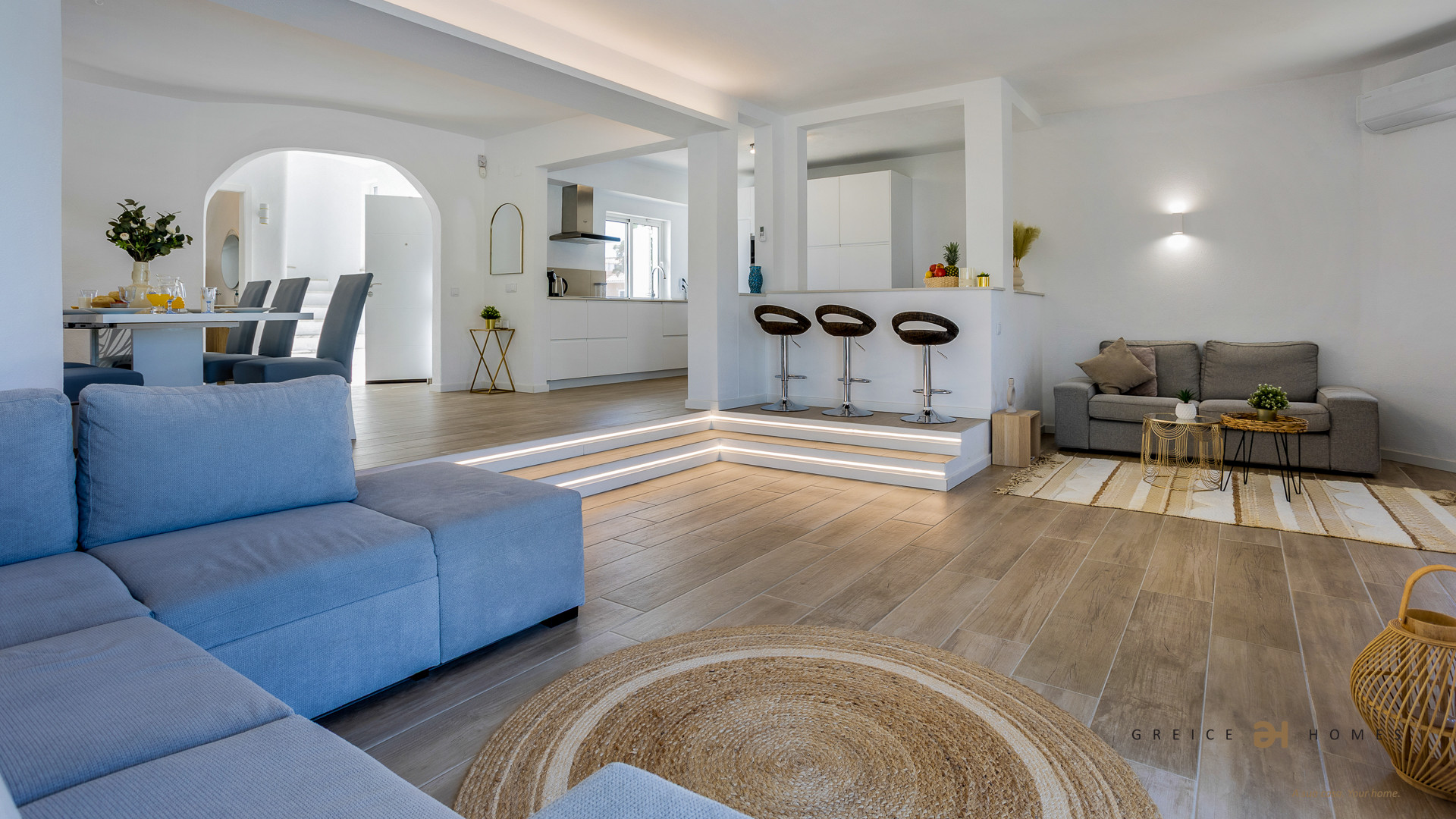 On the ground floor, you will find a bright living room, dining area, and a fully equipped kitchen with dishwasher, oven, microwave and refrigerator, as well as a laundry room with washing machine and dryer.