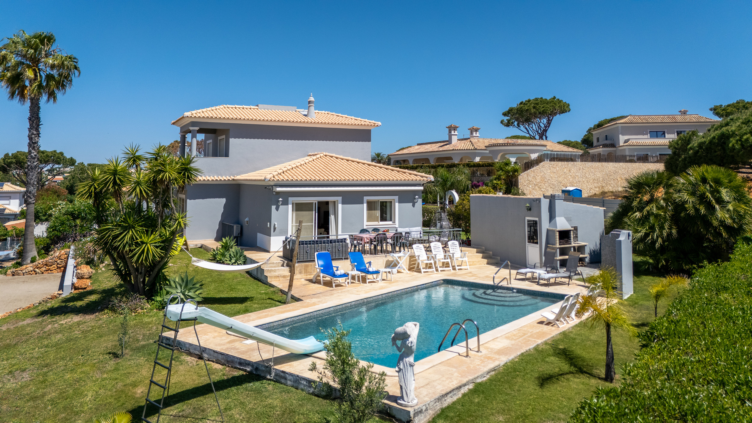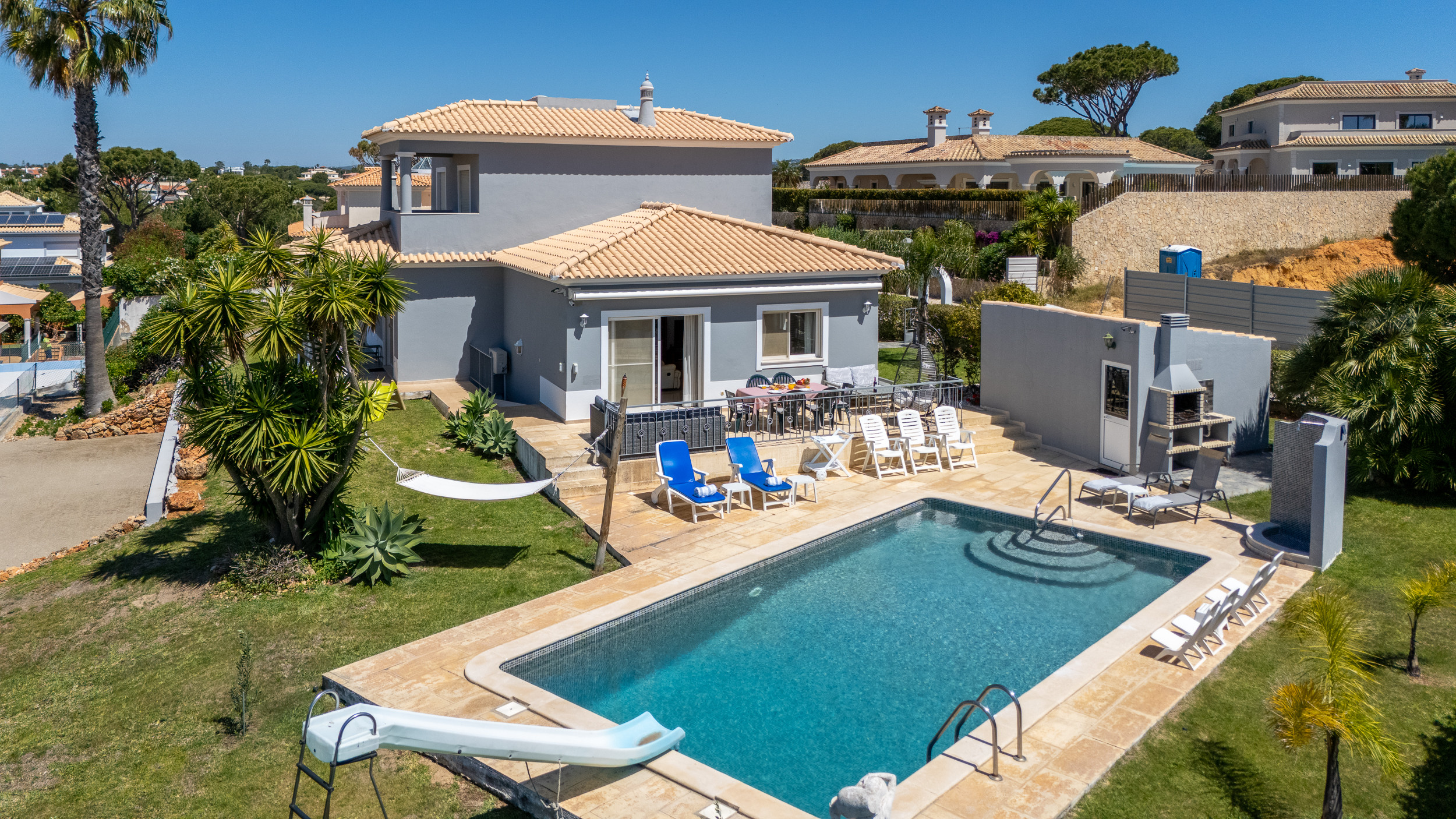 The villa is located close to supermarkets, restaurants, golf courses and several local attractions. Aquashow water park is only 2 km away, Almargem and Quarteira beaches are about 4 km away, and Faro Airport is approximately 20 km from the property. The area also offers easy access to Ria Formosa, Quinta do Lago, Vilamoura and other Algarve highlights.