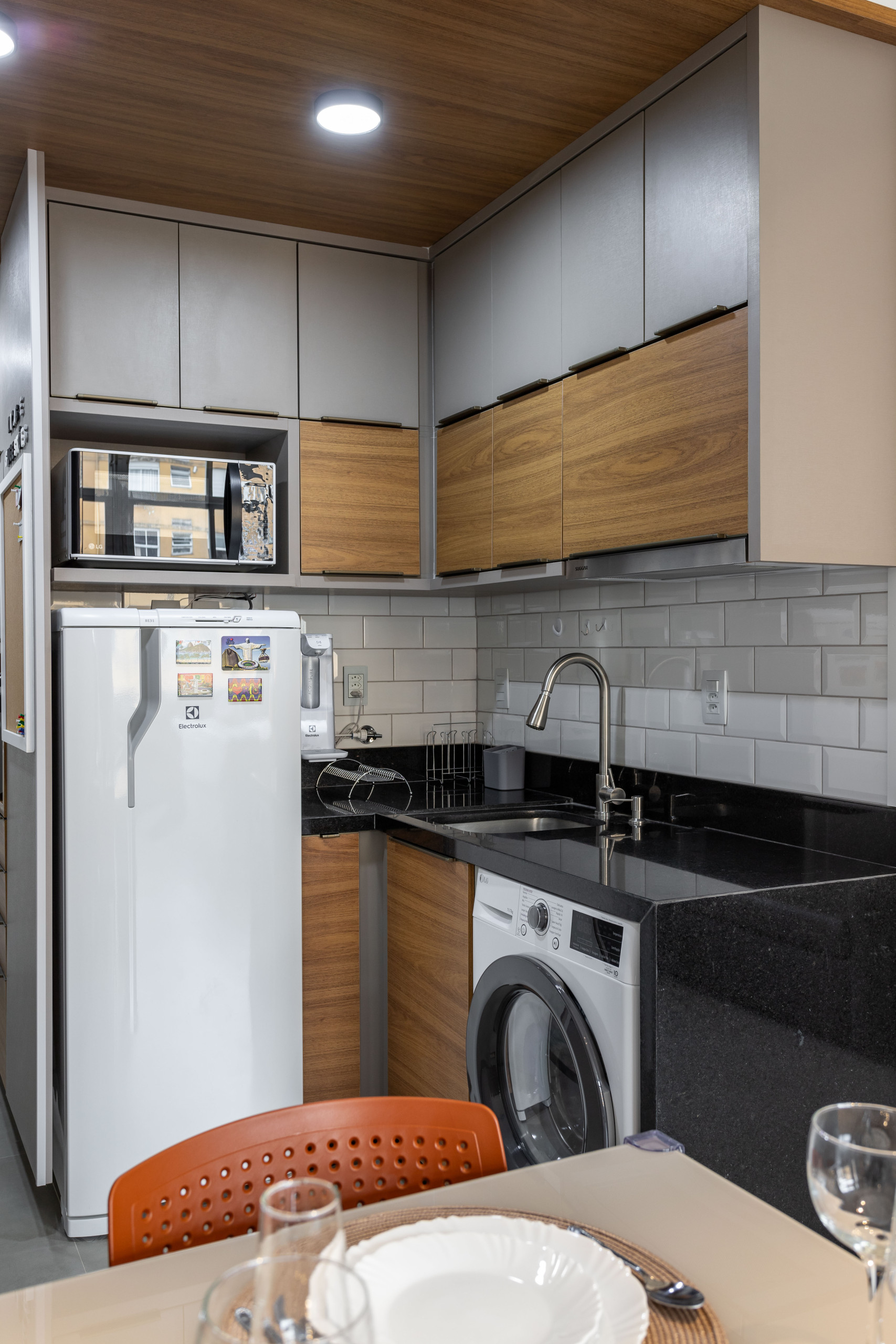 La cuisine américaine, à mixte: gaz et électricité, est équipée avec réfrigérateur, micro-ondes, congélateur, vaisselle/couverts, cafetière, presse-agrumes, cuisinière, assiettes et bols.
